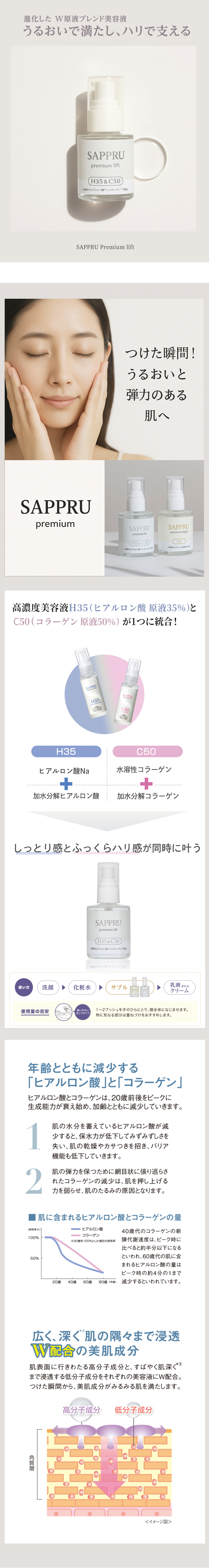 - 肌表面から角質層深部まで浸透する2つのヒアルロン酸*1と2つのコラーゲン*2を配合。うるおいとハリ・弾力のある、しっとりプルンとした肌へと導きます。