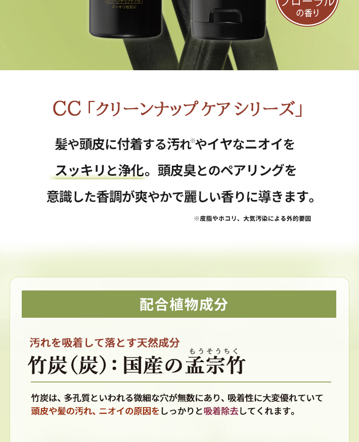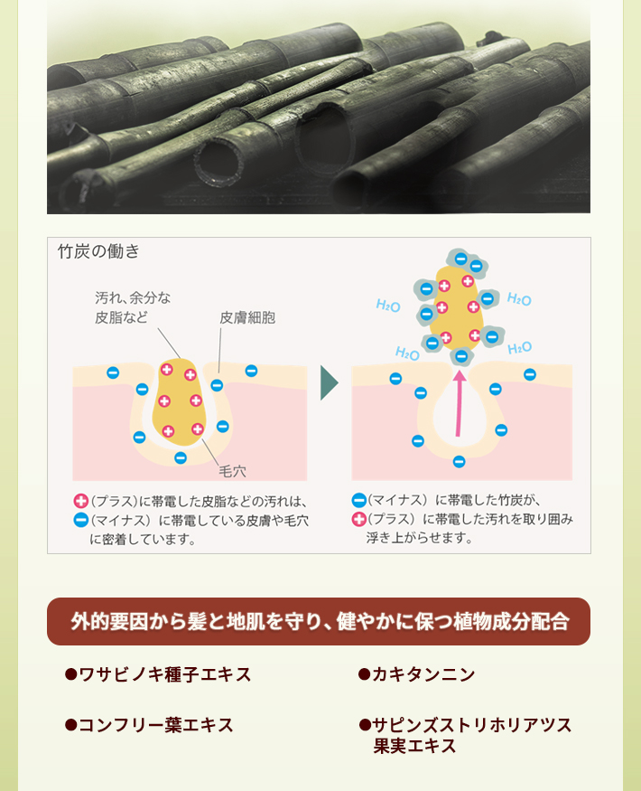 - 地肌や髪の気になるニオイをケアする竹炭(炭)を配合。