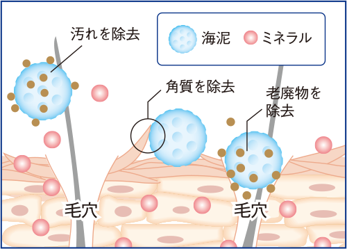 軟質多孔性の超微粒子「海泥」は、毛穴(約0.2ミリ)よりも小さなミクロの微粒子(20~30ミクロン ※1ミクロンは千分の1ミリ)で、その表面には、細かな穴が無数にあいていて、汚れを吸着・除去する働きに大変優れています。肌のザラつきやくすみの原因となる、古い角質や毛穴の奥に詰まった汚れ・老廃物をしっかり落として、健やかで透明感のある肌に導きます。