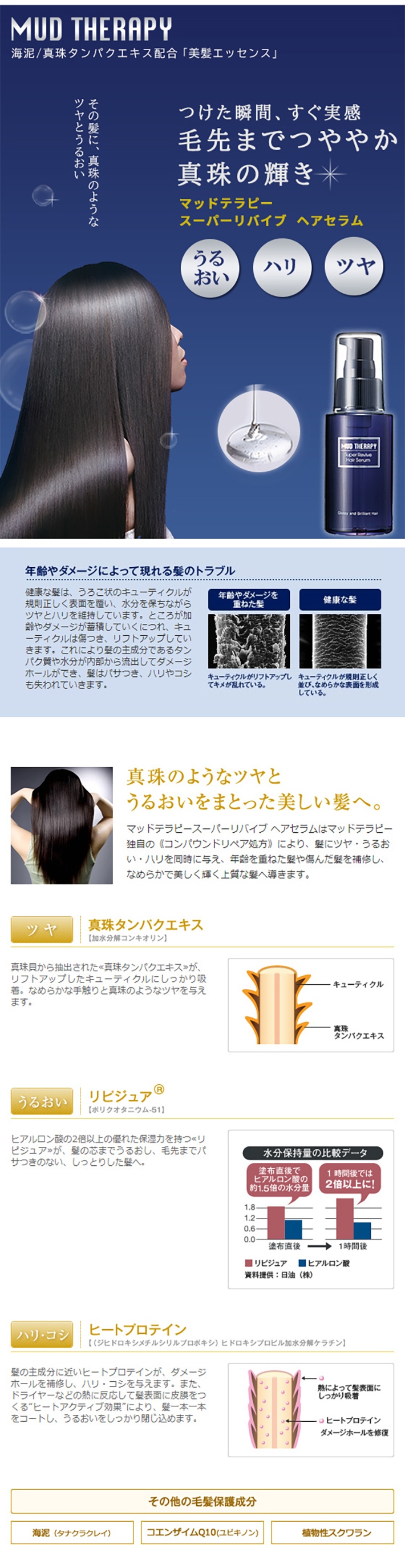 真珠タンパクエキス(加水分解コンキオリン)・水溶性コラーゲン・コエンザイムQ10(ユビキノン)・ヒートプロテイン((ジヒドロキシメチルシリルプロポキシ)ヒドロキシプロピル加水分解ケラチン)・リピジュア(ポリクオタニウム-51)・植物性スクワラン・海泥(タナクラクレイ)他