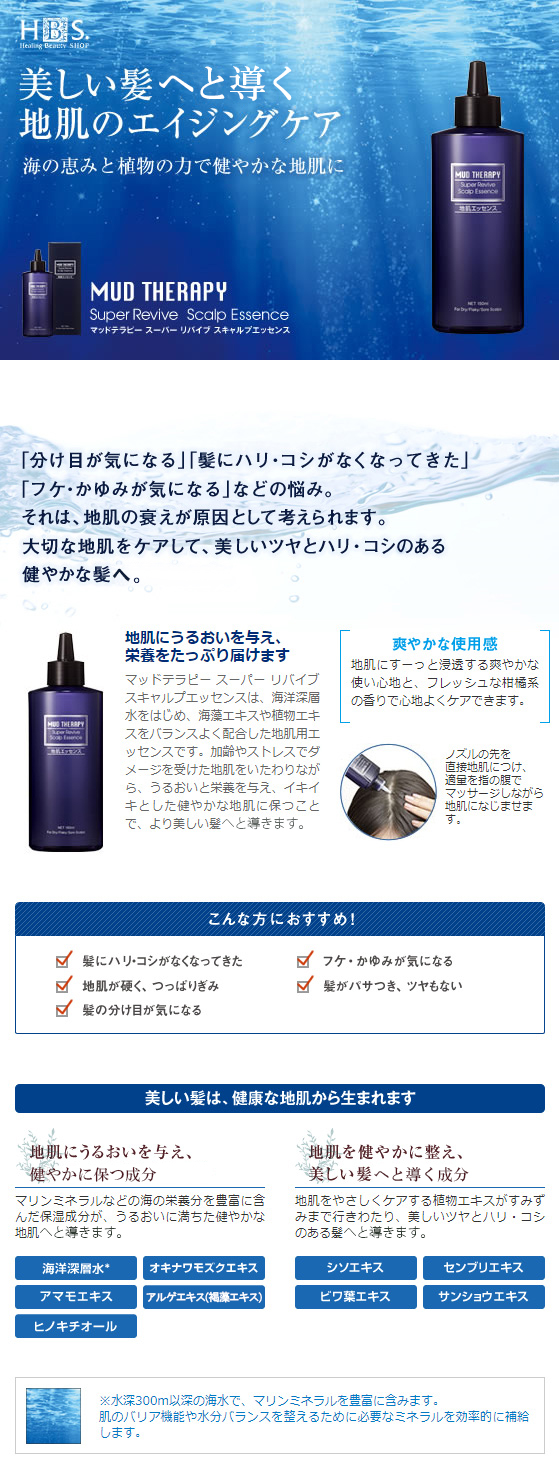 海洋深層水をはじめ、海藻エキスや植物エキスをバランスよく配合した地肌用エッセンスです。加齢やストレスでダメージを受けた地肌をいたわりながら、うるおいと栄養を与え、イキイキとした健やかな地肌に保つことで、より美しい髪へと導きます。