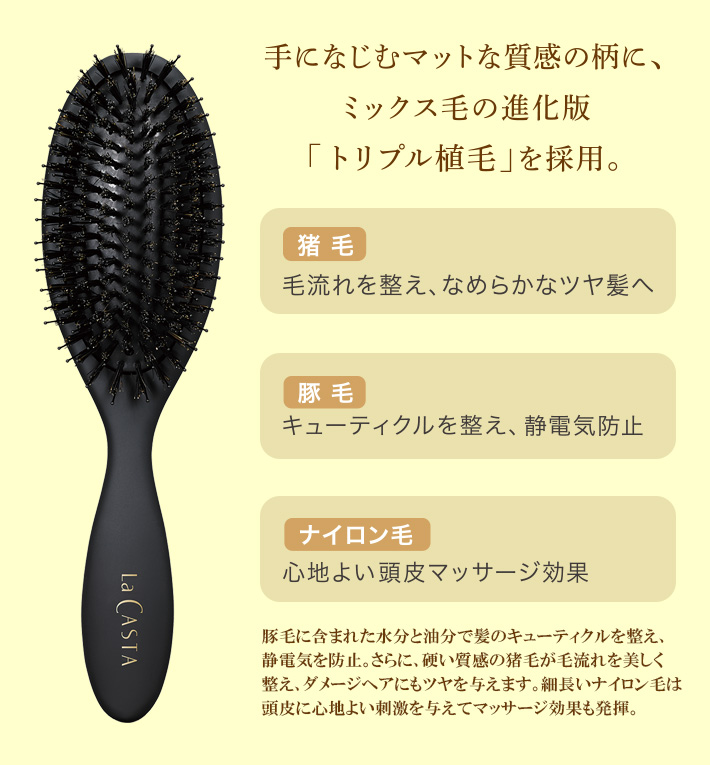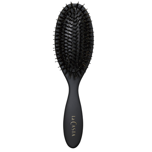 - ラ・カスタ オフィシャル ヘッドセラピストプロデュースのもと開発されたミックス毛の進化版。「猪毛」「豚毛」「ナイロン毛」3つの素材の特徴を最大限に引き出したラグジュアリーな使用感のヘアブラシです。ブラシの柄は手によく馴染むマットな質感となっています。