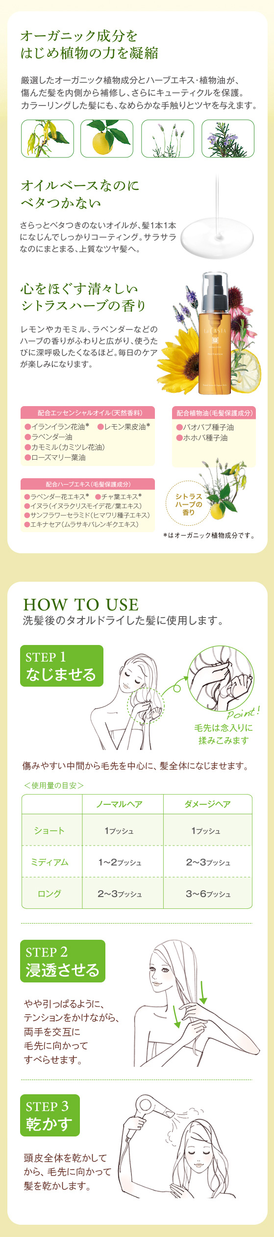 濡れ髪に数プッシュしたオイルを薄く延ばして塗布すると乾かすだけでサラサラになります