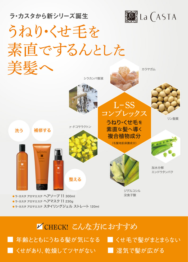 - うねり・くせ毛を素直でするんとした髪へ導くL-SSコンプレックスやオーガニック植物成分配合。傷んだ髪を補修・保護しながら、うねりやくせ毛をうるおいとまとまりのある美しいツヤ髪に仕上げます。