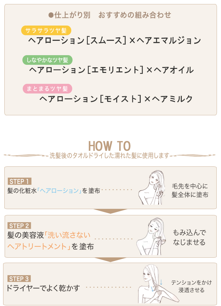 シャンプーまたはトリートメント後、タオルドライした濡れた髪全体になじませるように塗布し、その後ドライヤー等で乾かしてください。ミドルヘアの方でポンプ1~2プッシュが標準使用量ですが、髪の長さによって調整してください。朝のスタイリング時など、乾いた髪に使用する場合は量を少なくしてください。洗い流す必要はありません。