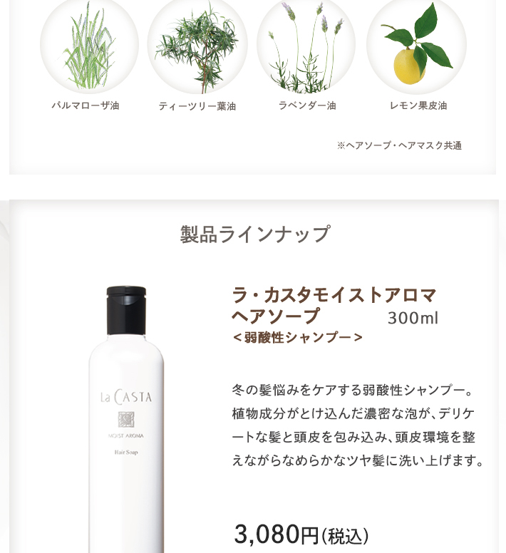 パルマローザ油、ティーツリー葉油、ラベンダー油、レモン果皮油