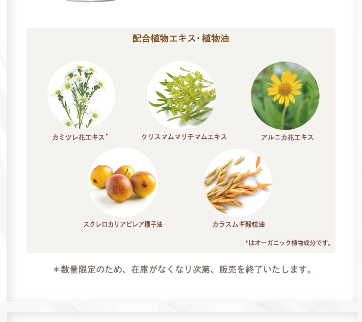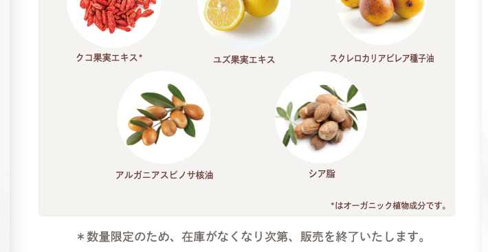 クコ果実エキス*、ユズ果実エキス、スクレロカリアビレア種子油、アルガニアスピノサ核油、シア脂