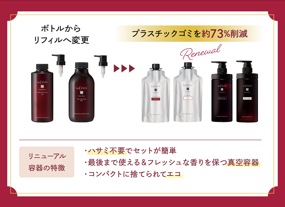 2025年8月27日(水)よりラ・カスタ アロマ リヴァイタ シリーズのヘアソープ・ヘアマスクの容器が、より環境にやさしく、より使い続けやすく生まれ変わります。